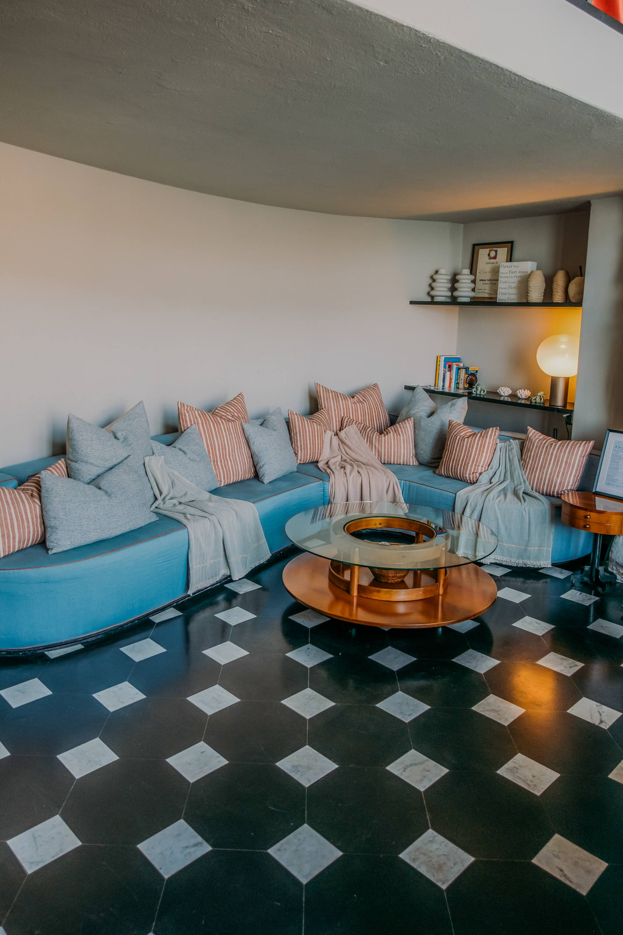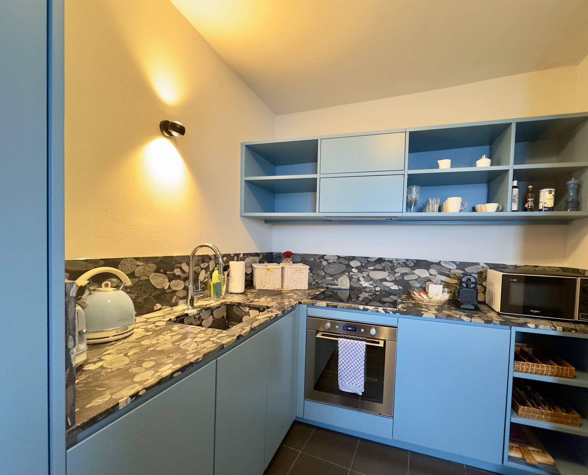 Heller Wohnbereich: Beinhaltet eine voll ausgestattete Küchenzeile mit Gasherd, Kühlschrank, Nespresso-Kaffeemaschine und einem Esstisch. Das praktische ausziehbare Doppelbett ist perfekt für zusätzliche Gäste.