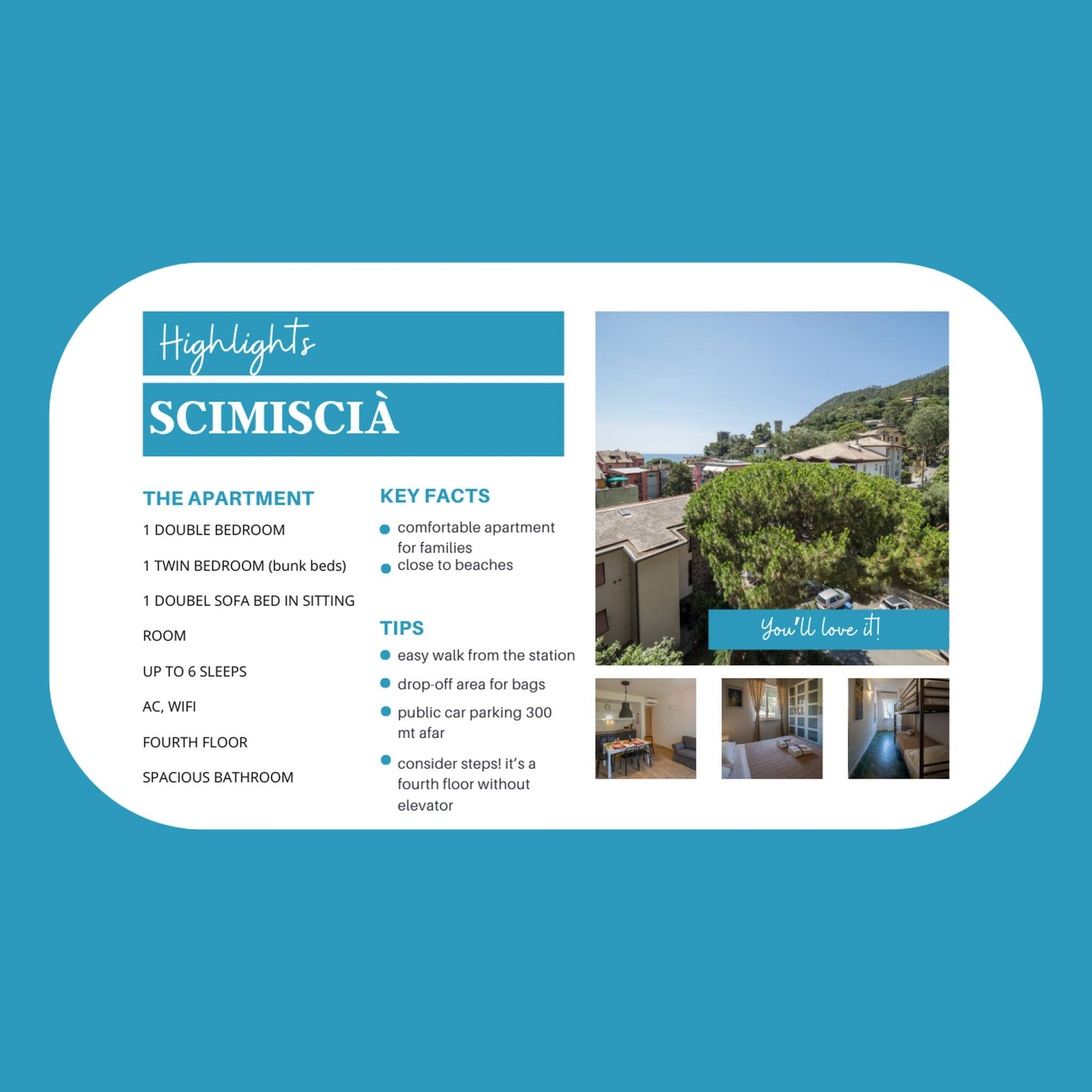 Die Ferienwohnung in Monterosso al Mare verfügt über 2 Schlafzimmer und hat eine Kapazität für 6 Person(en). Unterkunft verfügt über 70 m². Die Unterkunft verfügt über eine Waschmaschine, ein Internetanschluss (WLAN), ein Föhn, eine Zentralheizung, eine Klimaanlage, 1 Fernseher.Die Offene Küche mit Gas-Kochfeld ist ausgestattet in einen Kühlschrank, eine Mikrowelle, ein Backofen, eine Spülmaschine, Geschirr/Besteck, Kochutensilien, eine Kaffeemaschine, einen Toaster, einen Wasserkocher und Herdplatte.