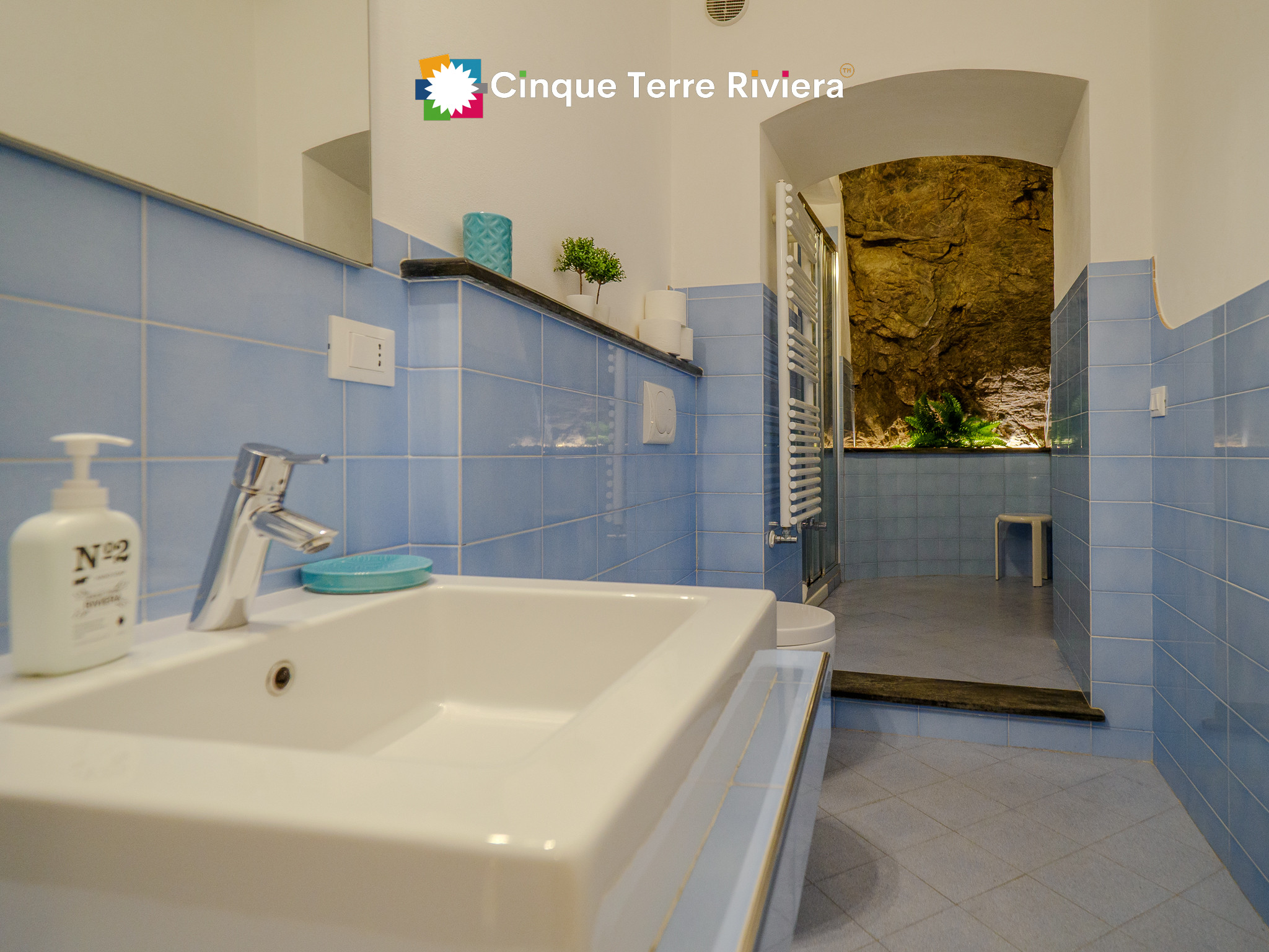 Ein Highlight der Wohnung ist das große blaue Badezimmer mit einer geräumigen Dusche - ein ungewöhnlicher Luxus in den kleinen Dörfern der Cinque Terre. Dieses Feature verleiht einen Hauch von Eleganz und Praktikabilität und macht Ihren Aufenthalt noch angenehmer.