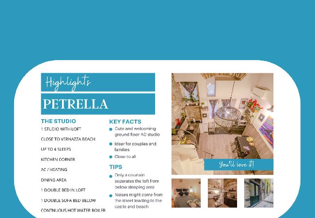 Die Ferienwohnung in Vernazza verfügt über 1 Schlafzimmer und hat eine Kapazität für 4 Person(en). Unterkunft verfügt über 45 m². Die Unterkunft verfügt über eine Waschmaschine, einen Trockner, ein Internetanschluss (WLAN), ein Föhn, eine Zentralheizung, eine Klimaanlage, 1 Fernseher.Die Offene Küche mit Induktions-Kochfeld ist ausgestattet in einen Kühlschrank, eine Mikrowelle, Gefrierschrank, Geschirr/Besteck, Kochutensilien, eine Kaffeemaschine, einen Wasserkocher und Herdplatte.