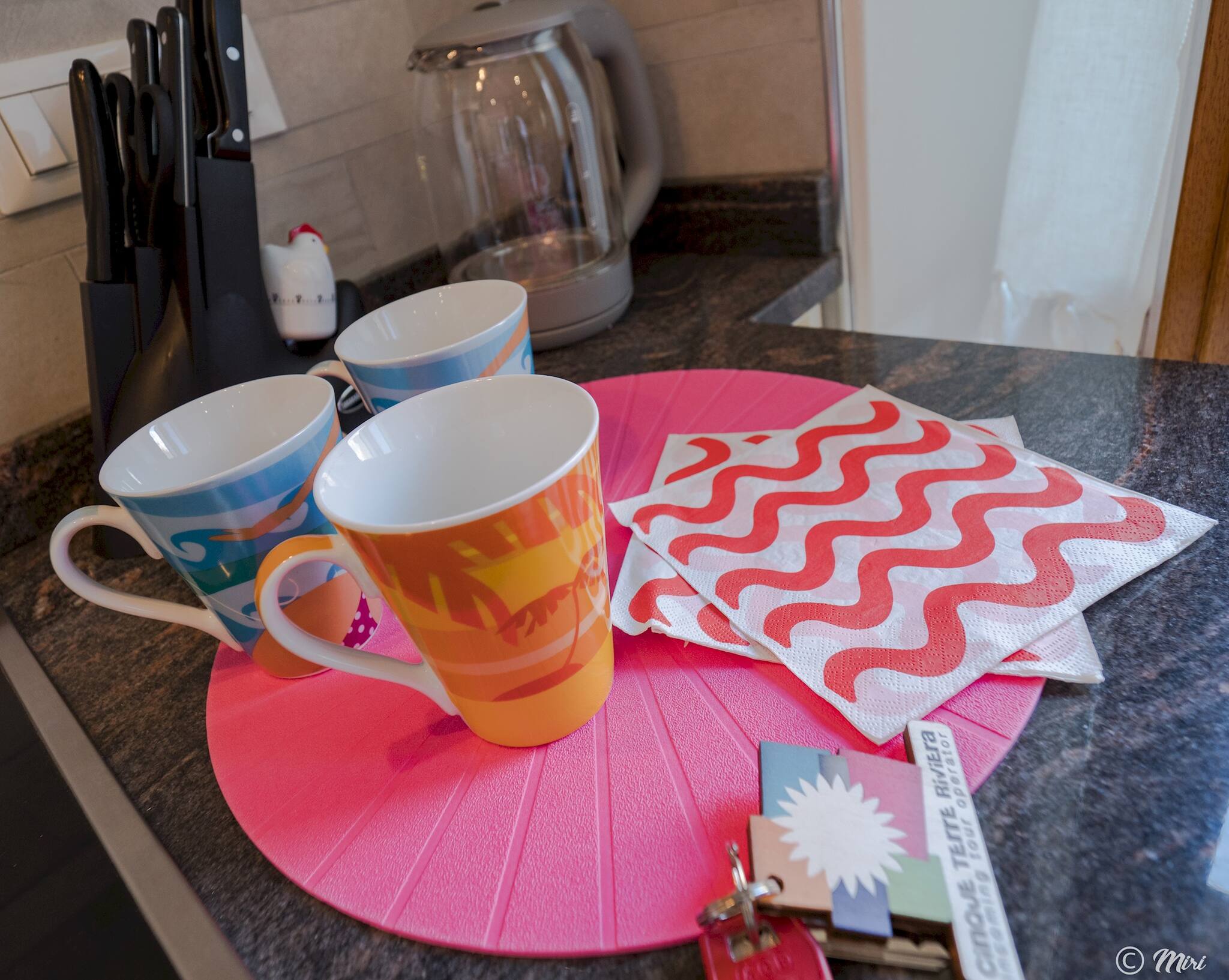 Voll ausgestattete Küchenzeile: Dekoriert mit niedlichen comic-thematischen Fliesen, perfekt zum Zubereiten von Mahlzeiten mit frischen lokalen Zutaten.