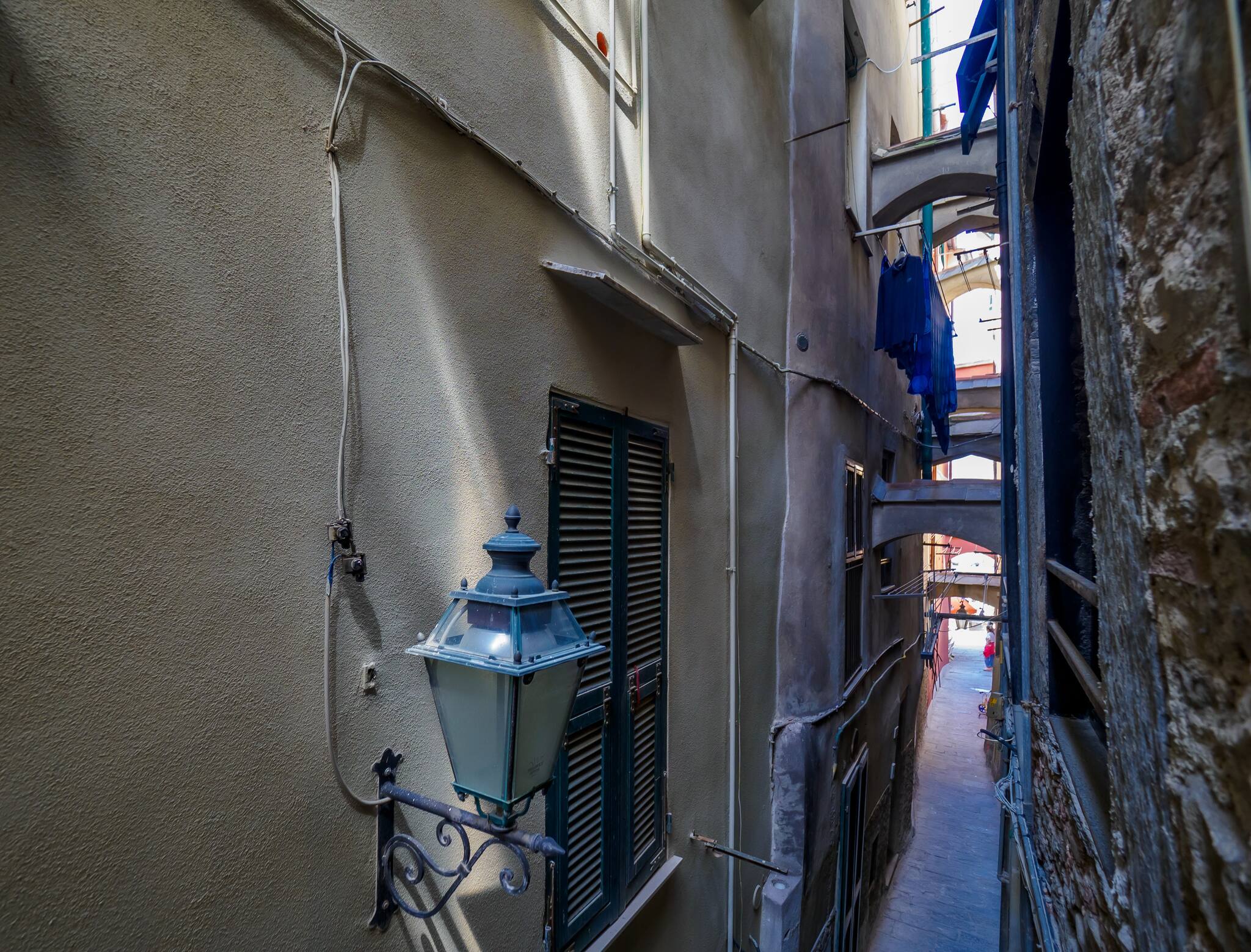 , einemIsch Esstisch und großgroßen Fenstern, die auf, die sich auf einen typischenischenischenchen Hinterweg namens "carug"etto öffnen (schmschmaler CaruRugio = typischer typischer ligligurischer Hinter),weg), der zumum zum Hauptplatzplatz führt.