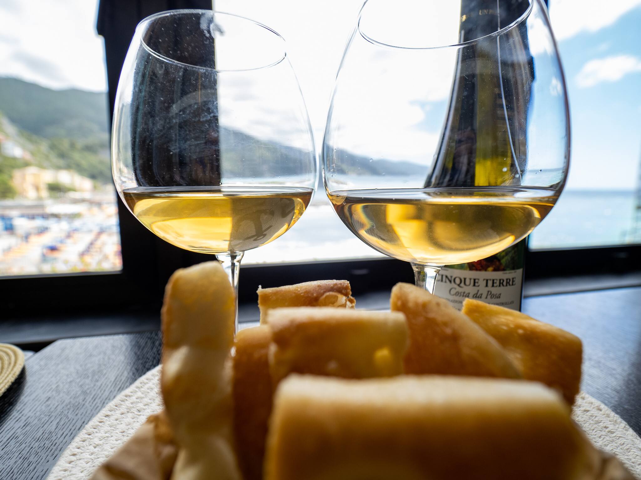 Scenic living-dining room with full-height windows framing the Cinque Terre coast.