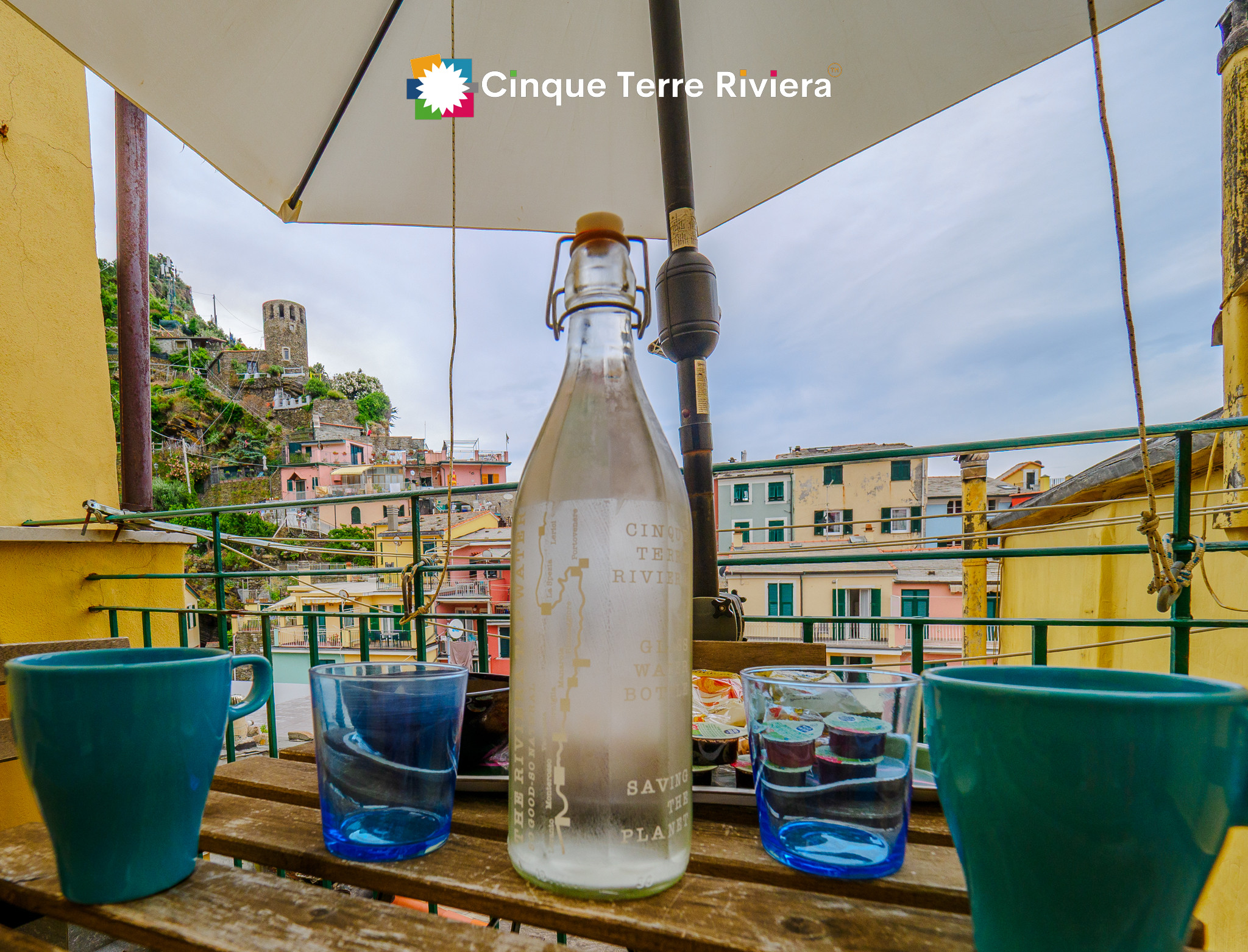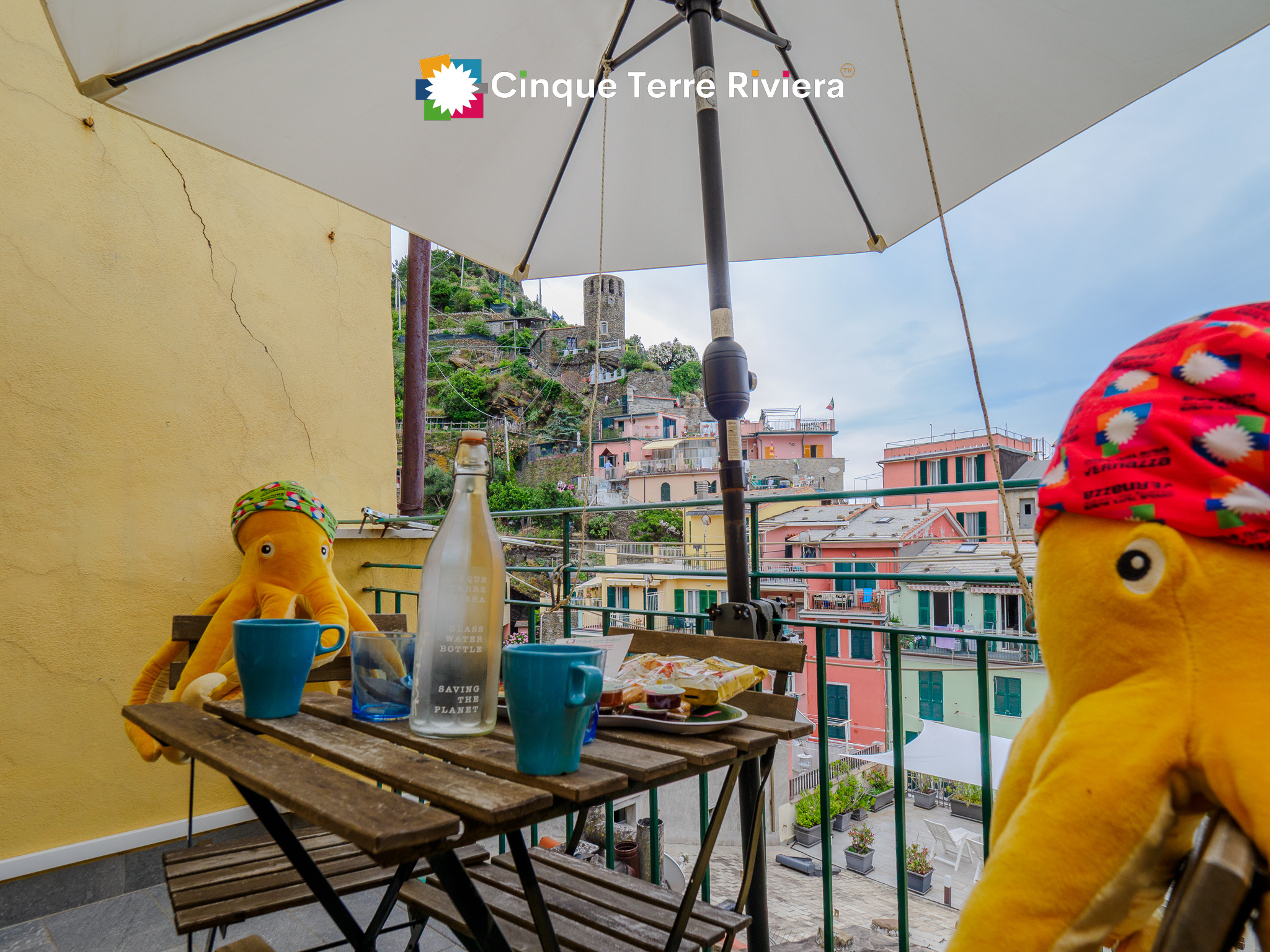 Terraza: La amplia terraza está amueblada con una mesa, ideal para cenas al aire libre, desayunos o simplemente para admirar las incomparables vistas de la costa de Vernazza.