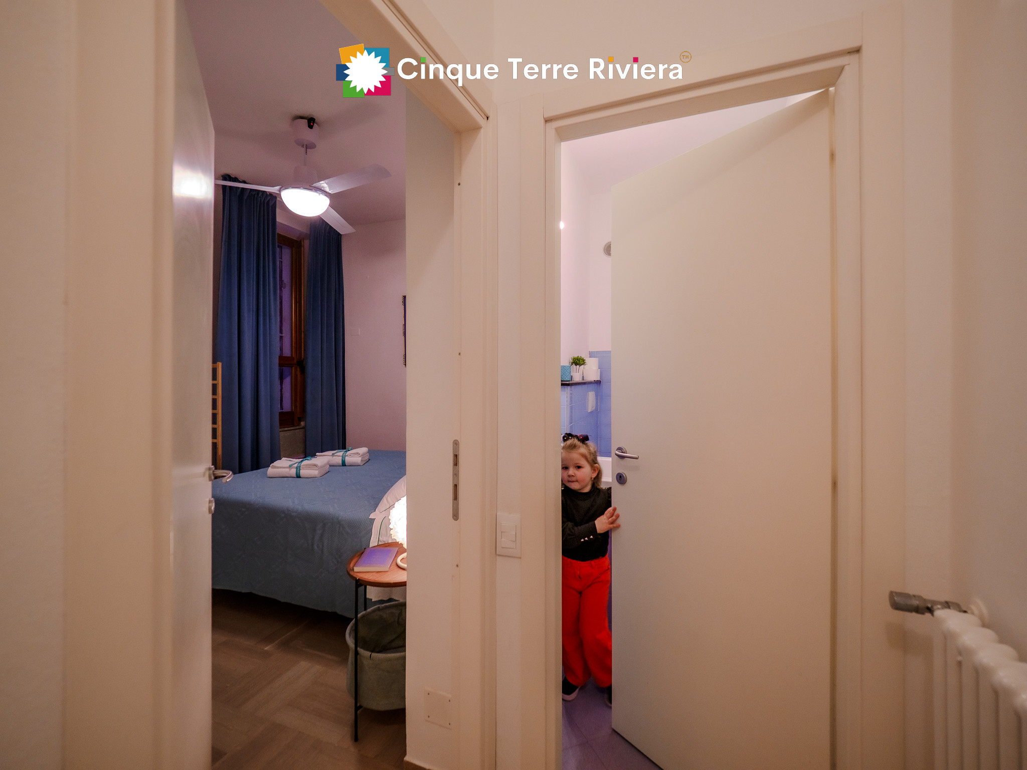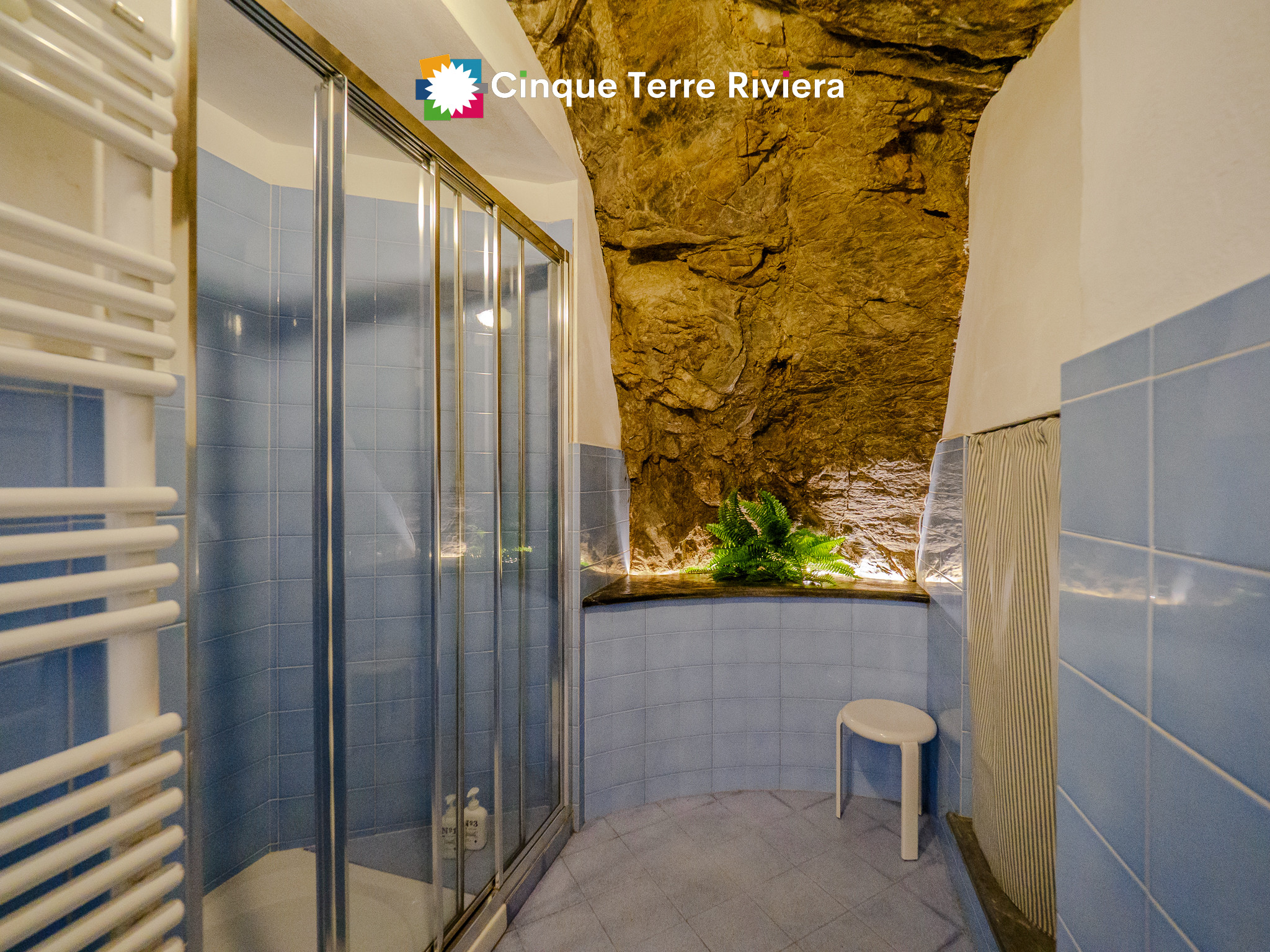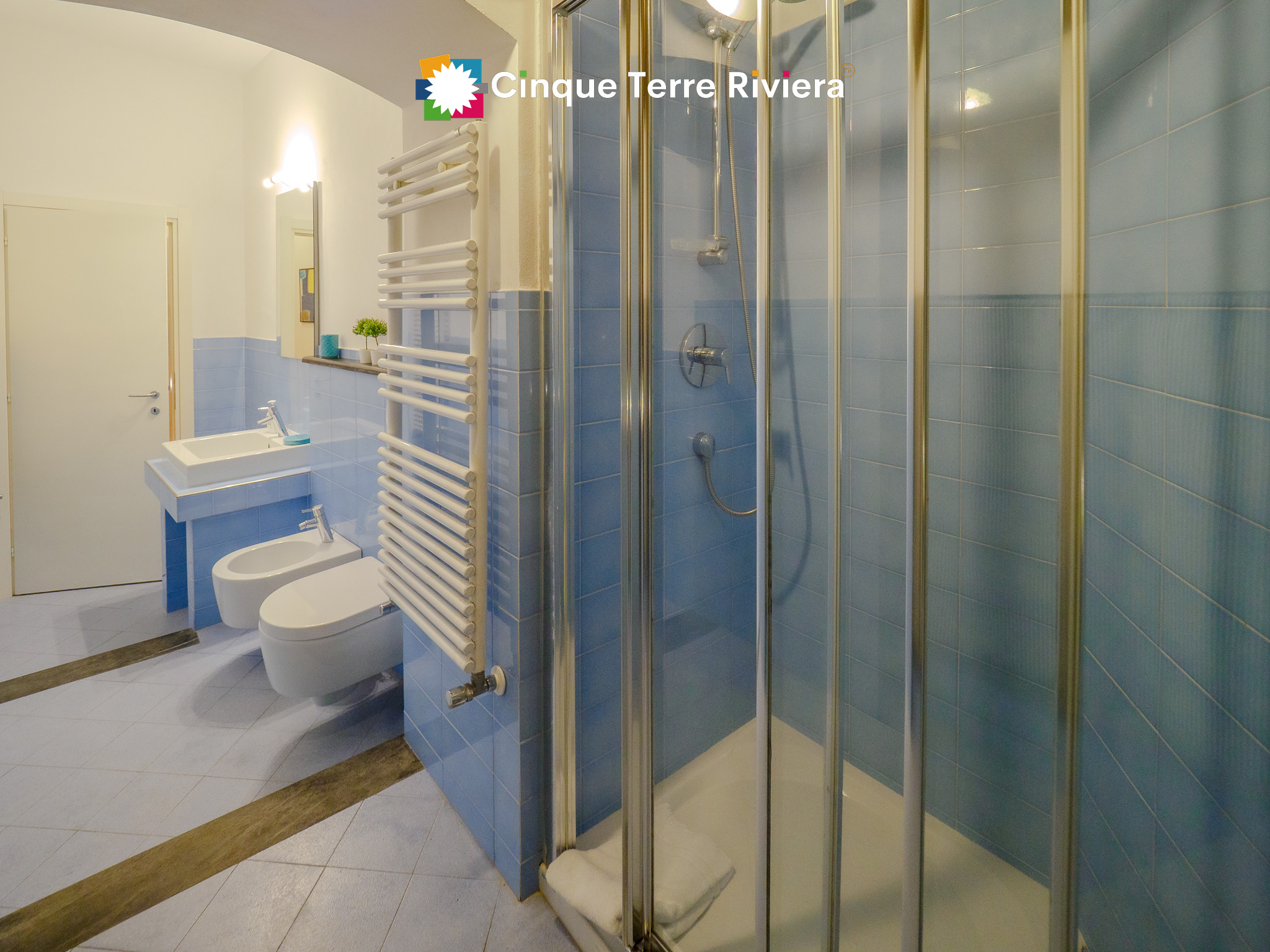 Uno de los puntos destacados del apartamento es su gran baño azul con una ducha espaciosa, un lujo poco común en los pequeños pueblos de Cinque Terre. Esta característica añade un toque de elegancia y practicidad, haciendo su estancia aún más agradable.