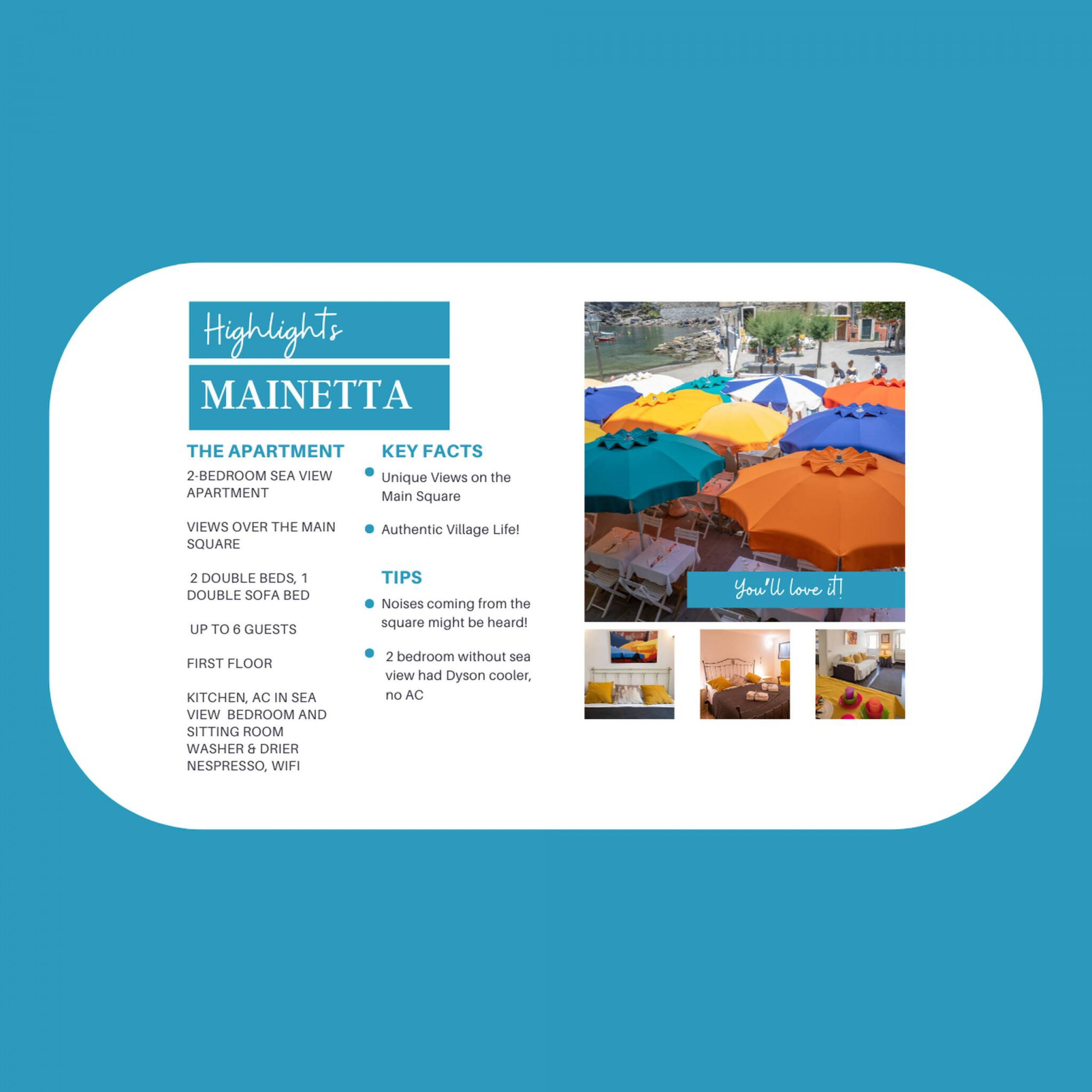 El apartamento en Vernazza posee 2 dormitorio(s) y capacidad para 6 personas. Alojamiento de 74 m². Dispone de lavadora, secadora, plancha, acceso internet (wifi), secador, calefacción central, aire acondicionado, 1 ventilador, 1 Televisor.La cocina independiente, de gas, está equipada con nevera, microondas, horno, lavavajillas, vajilla/cubertería, utensilios/cocina, cafetera, hervidor de agua y fogones.