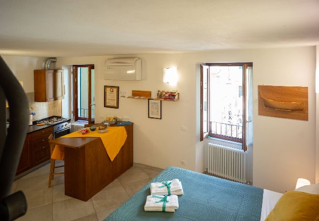 Área de estar de planta abierta: una distribución espaciosa con dos grandes ventanas que inundan el estudio de luz natural y ofrecen impresionantes vistas del pueblo de Vernazza.