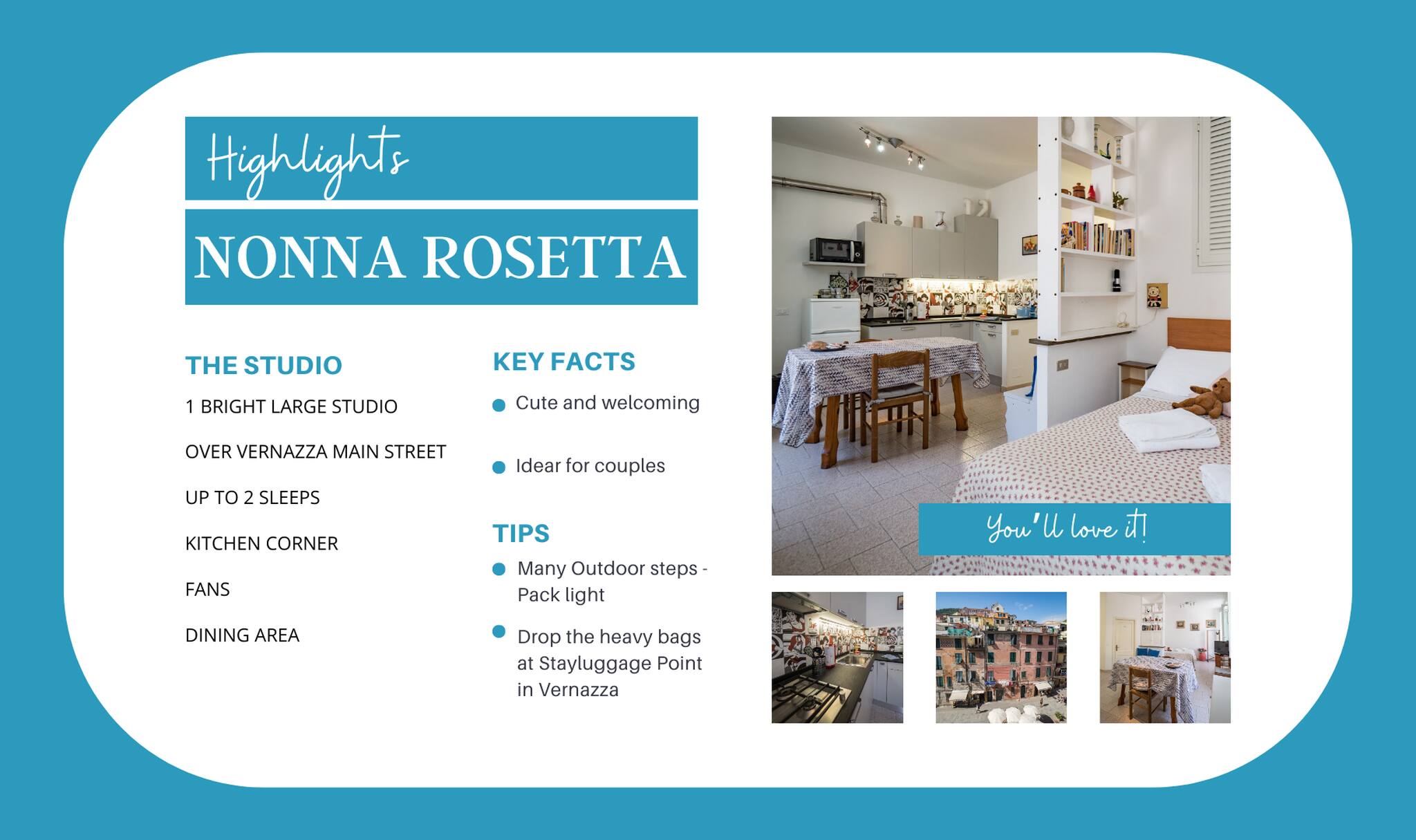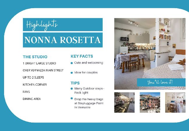 Que vous exploriez les rues de Vernazza, marchiez sur les sentiers panoramiques des Cinque Terre, ou simplement vous relaxiez avec une vue à couper le souffle, Nonna Rosetta Traditional est l'endroit parfait pour vous sentir chez vous. Immergez-vous dans la riche culture, la beauté et le charme de ce splendide village et créez des souvenirs qui dureront toujours.