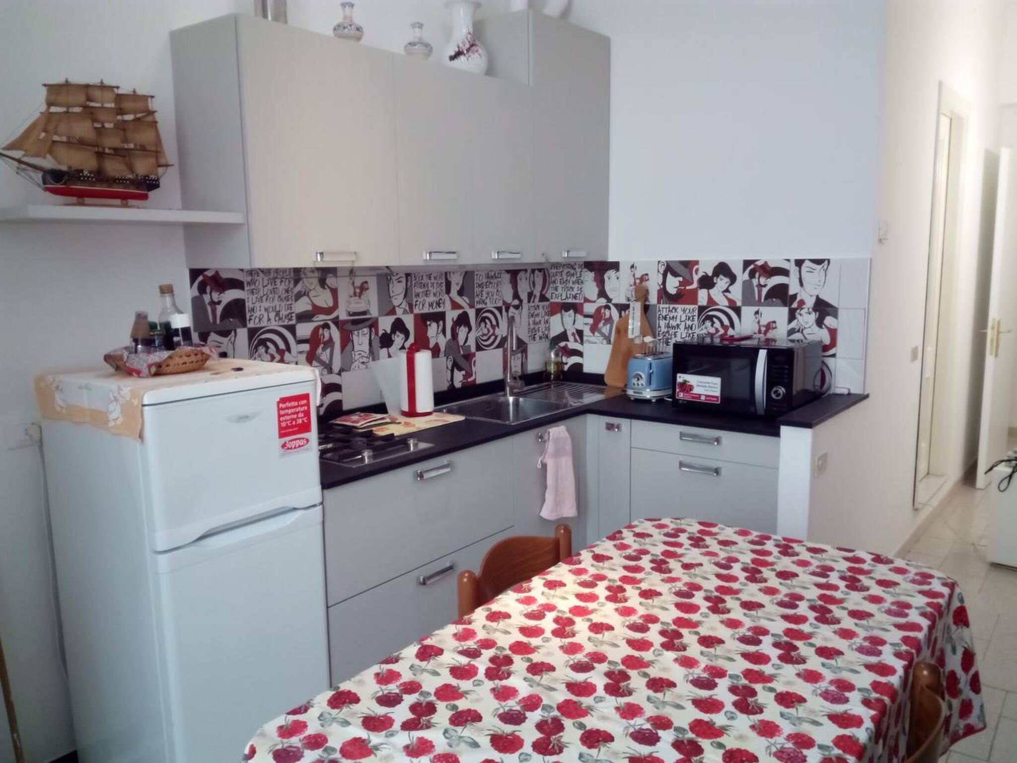 Kitchenette entièrement équipée : décorée avec des carreaux adorables sur le thème de la bande dessinée, parfaits pour préparer des repas avec des ingrédients locaux frais.