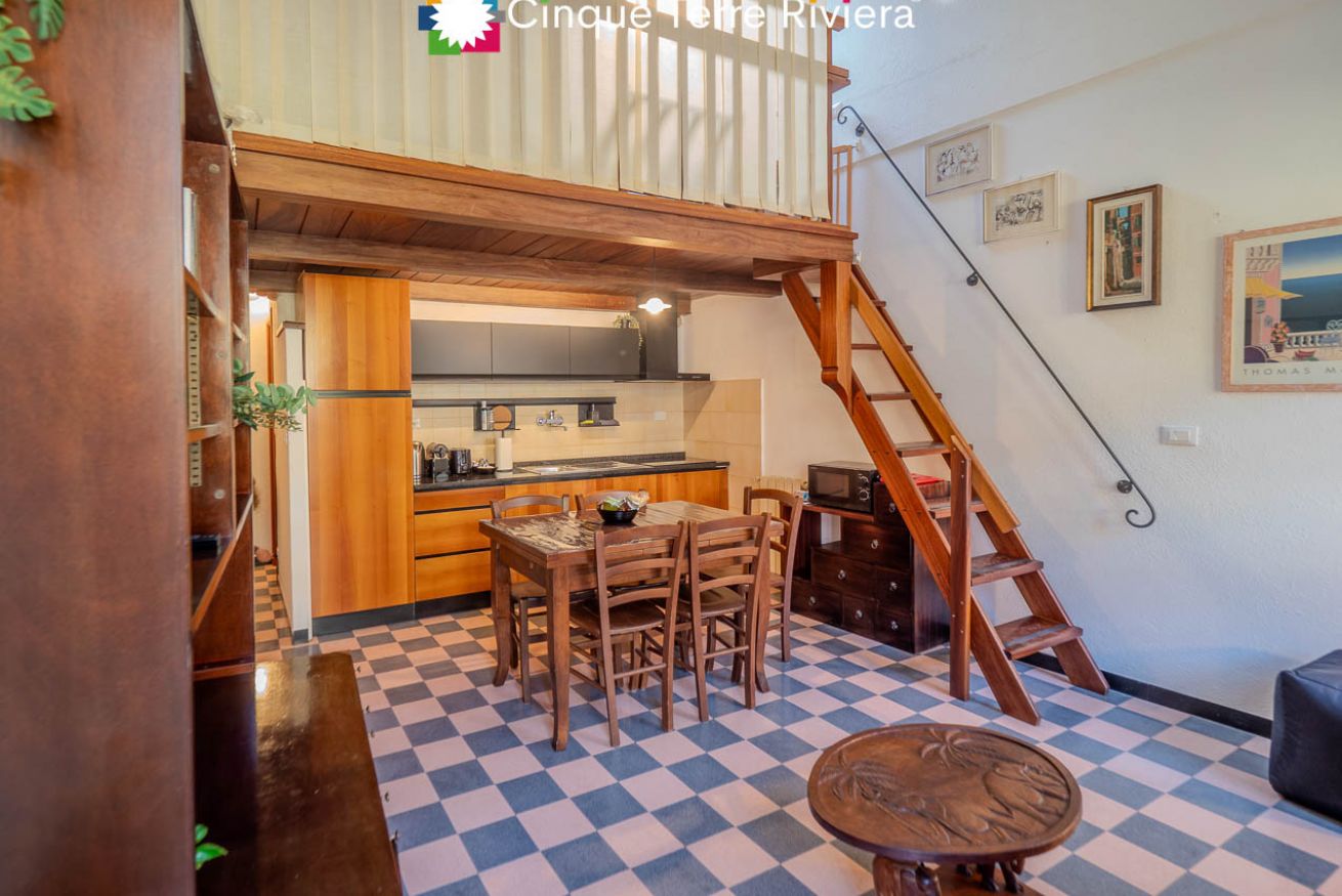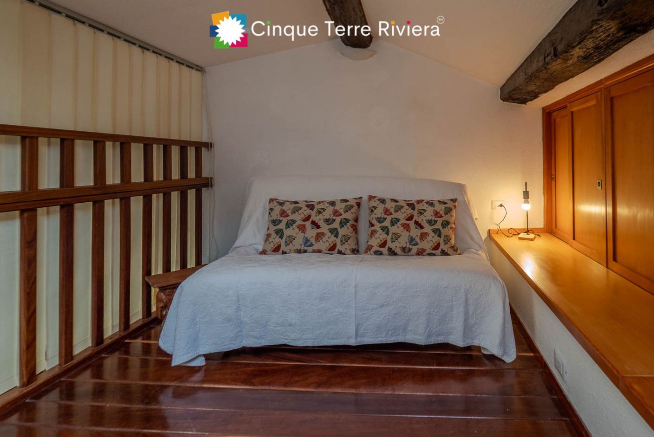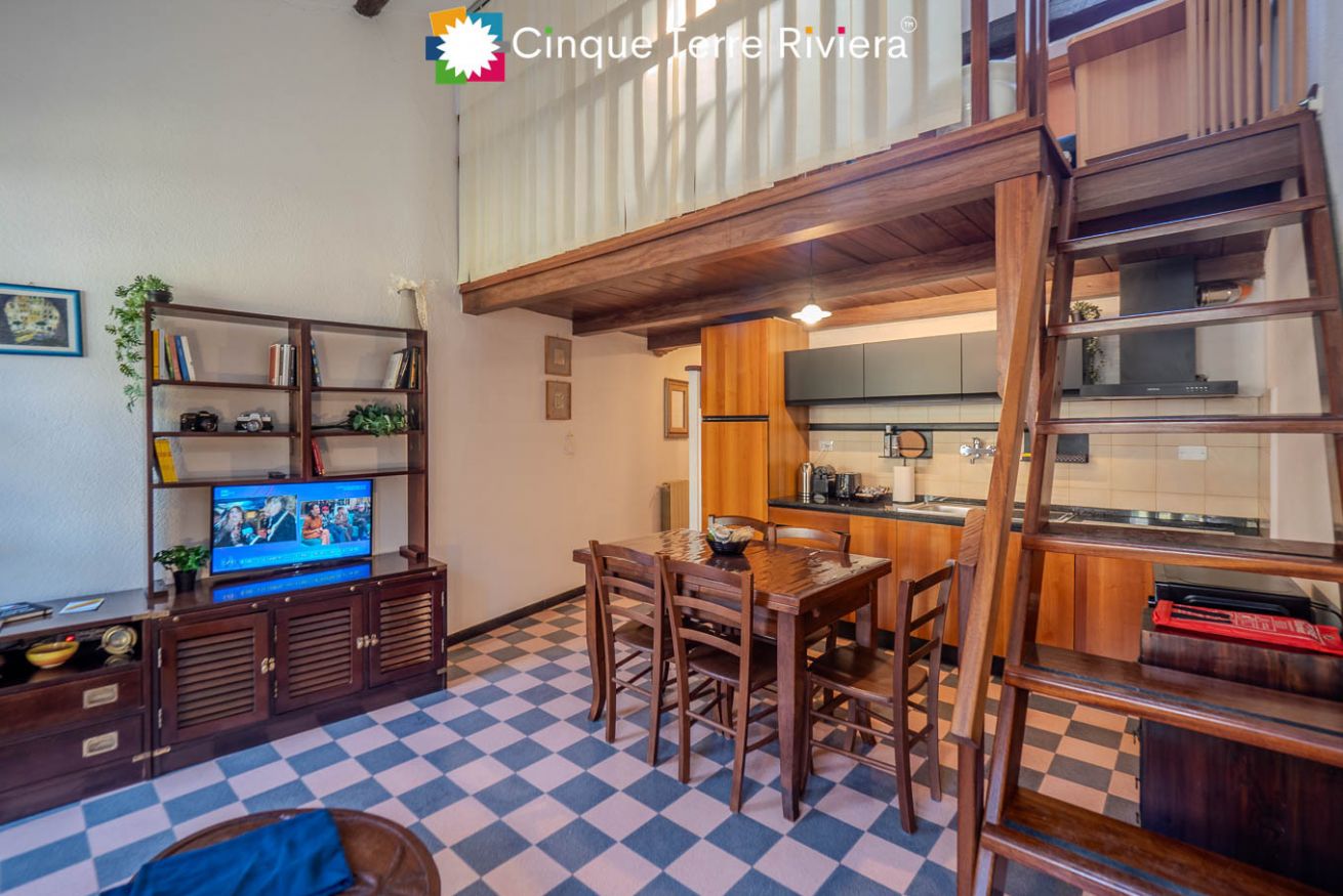 1 open-plan space with air-conditioned loft and a spacious living area with kitchen and lounge opening onto the balcony, with sea view, views over Vernazza’s main street and the vineyards. The loft offers a double bed and a beautiful office area ideal for smart working. The living area includes a fully equipped kitchen and a bright lounge with a single sofa bed