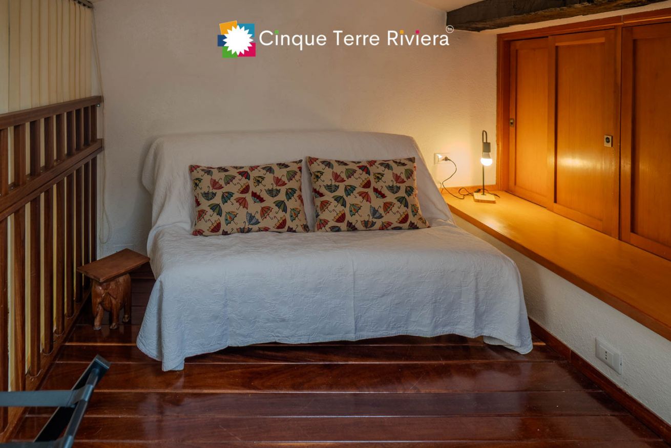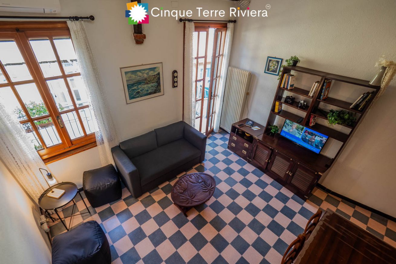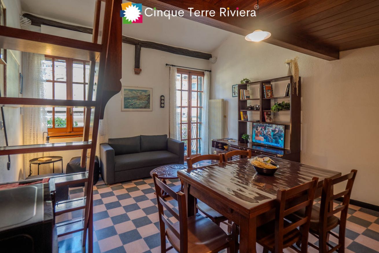 1 open-plan space with air-conditioned loft and a spacious living area with kitchen and lounge opening onto the balcony, with sea view, views over Vernazza’s main street and the vineyards. The loft offers a double bed and a beautiful office area ideal for smart working. The living area includes a fully equipped kitchen and a bright lounge with a single sofa bed