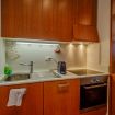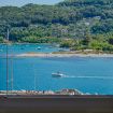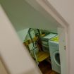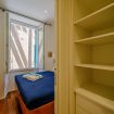 The apartment's compact layout, inspired by nautical design, pays homage to the village's maritime heritage. While the bedroom, bathroom, and kitchen spaces are modest in size, they contribute to the apartment’s unique charm and functionality.