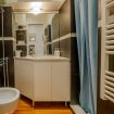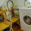 The bathroom is functional and well-equipped, featuring a practical shower. Adjacent to the bathroom is a storage space with a washing machine and drying rack, adding convenience for longer stays.