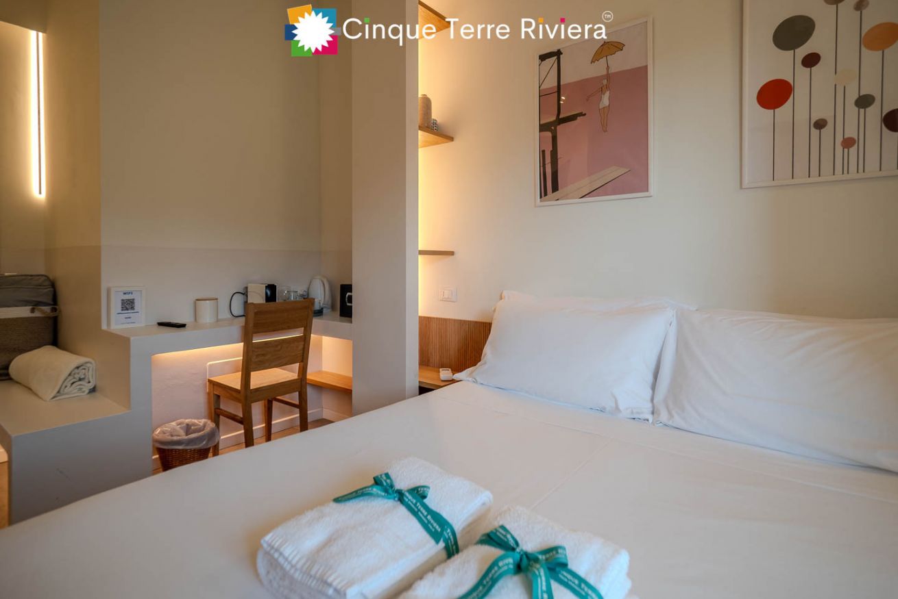 The real highlight of the room is the private balcony furnished with table and chairs, overlooking Levanto’s main street, the road that leads directly to the railway station. It is the ideal place to enjoy a coffee in the morning or let yourself be accompanied by the lively atmosphere of the town. The room features a private en-suite bathroom with shower, modern and functional, designed to guarantee comfort and privacy throughout the stay. The location is truly unbeatable: the station can be reached in only 2 minutes on foot (about 350 metres), the beaches are approximately 8 minutes away (600 metres), while the historic centre is only 6 minutes away (400 metres). A perfect solution for moving comfortably on foot and experiencing Levanto and the Cinque Terre without a car. Those arriving in Levanto by car will find several parking areas near the property. Guests can rely on the hospitality signed by Cinque Terre Riviera, with quality services, professional cleaning and dedicated assistance during the stay. Check-in must comply with Italian identification regulations, also in case of self check-in, and arrival time must be communicated in advance. Standard check-in time is from 3:00 pm to 6:30 pm. Arrivals beyond this time slot may incur an additional cost, while check-in after 10:00 pm is not possible.