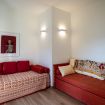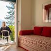 Living Area with Balcony: Spacious seating with sofas (one convertible into a double bed), large windows, and a balcony offering panoramic views of the lush Mediterranean landscape and Cinque Terre coastline.