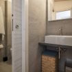Un baño de diseño moderno con ducha y acabados elegantes.