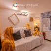 Open-plan living area with double sofa bed and Smart TV.