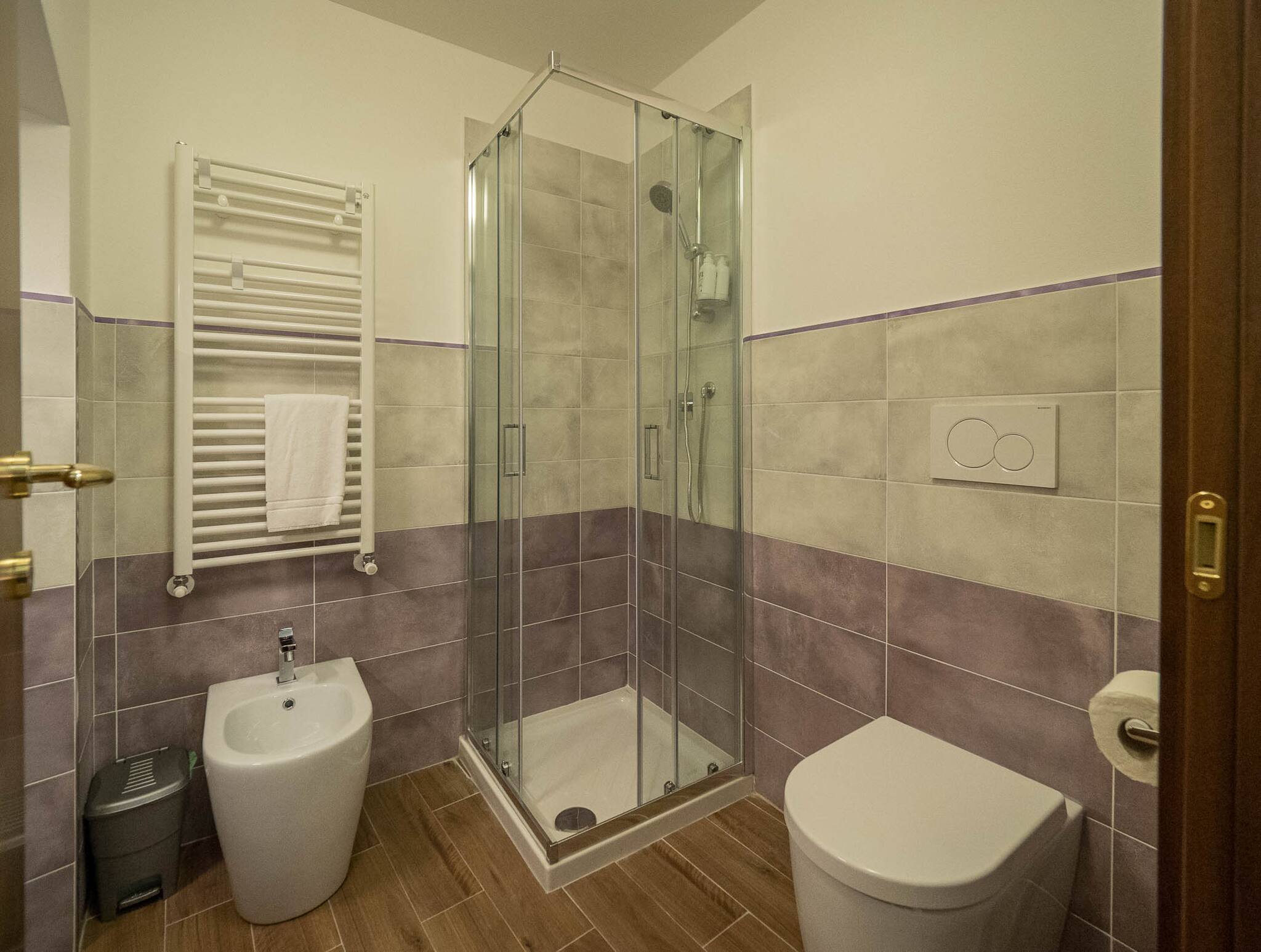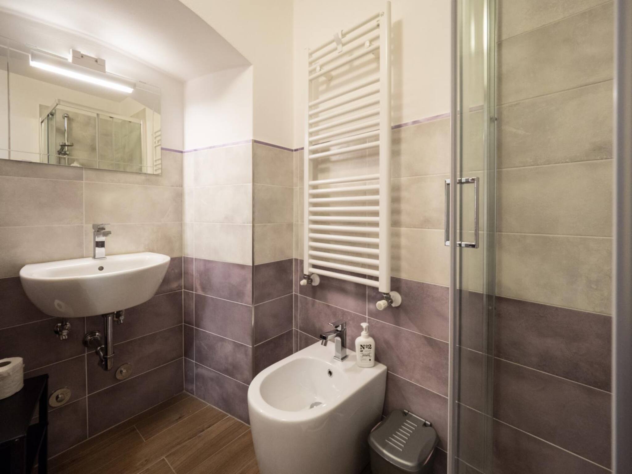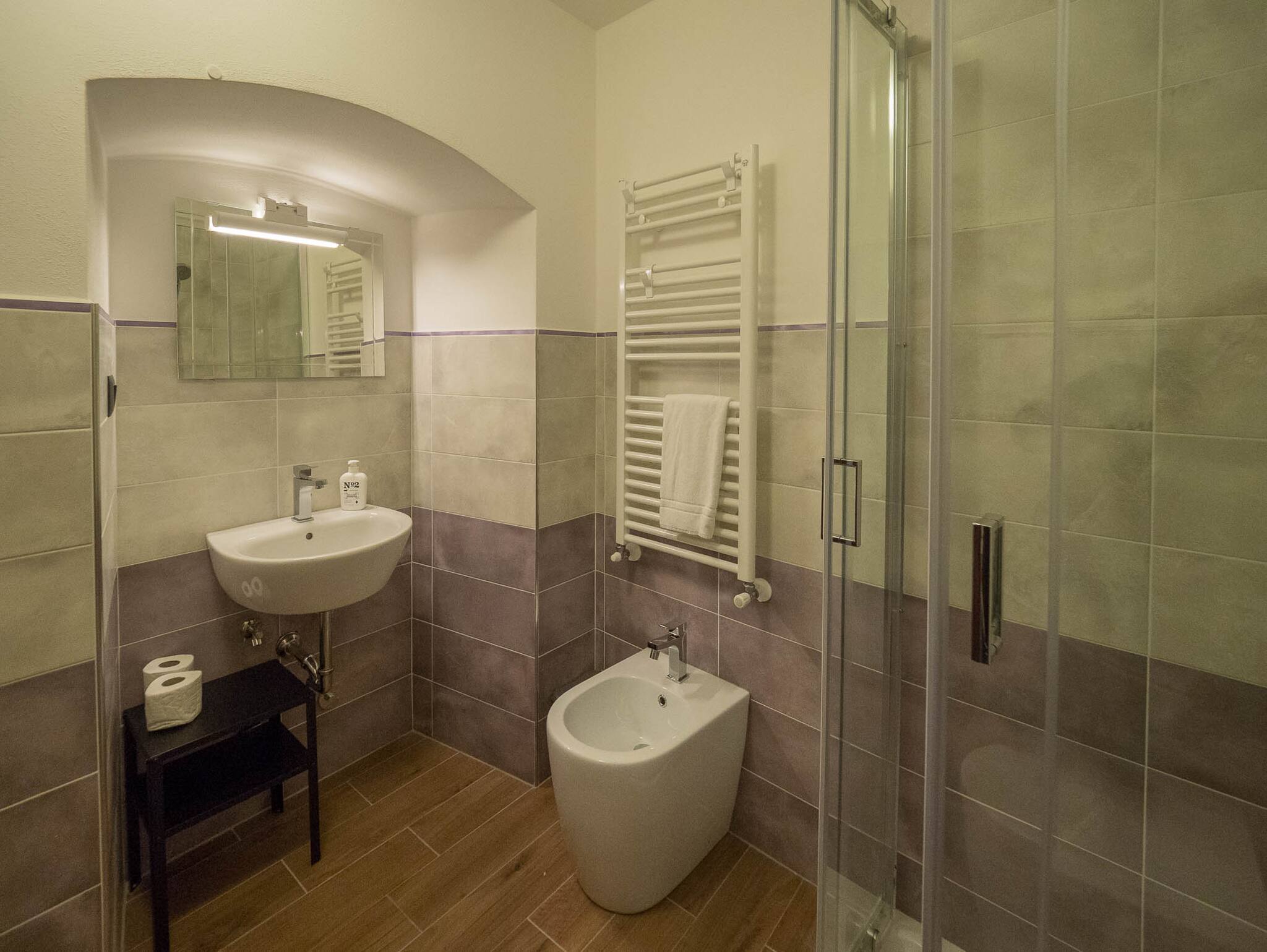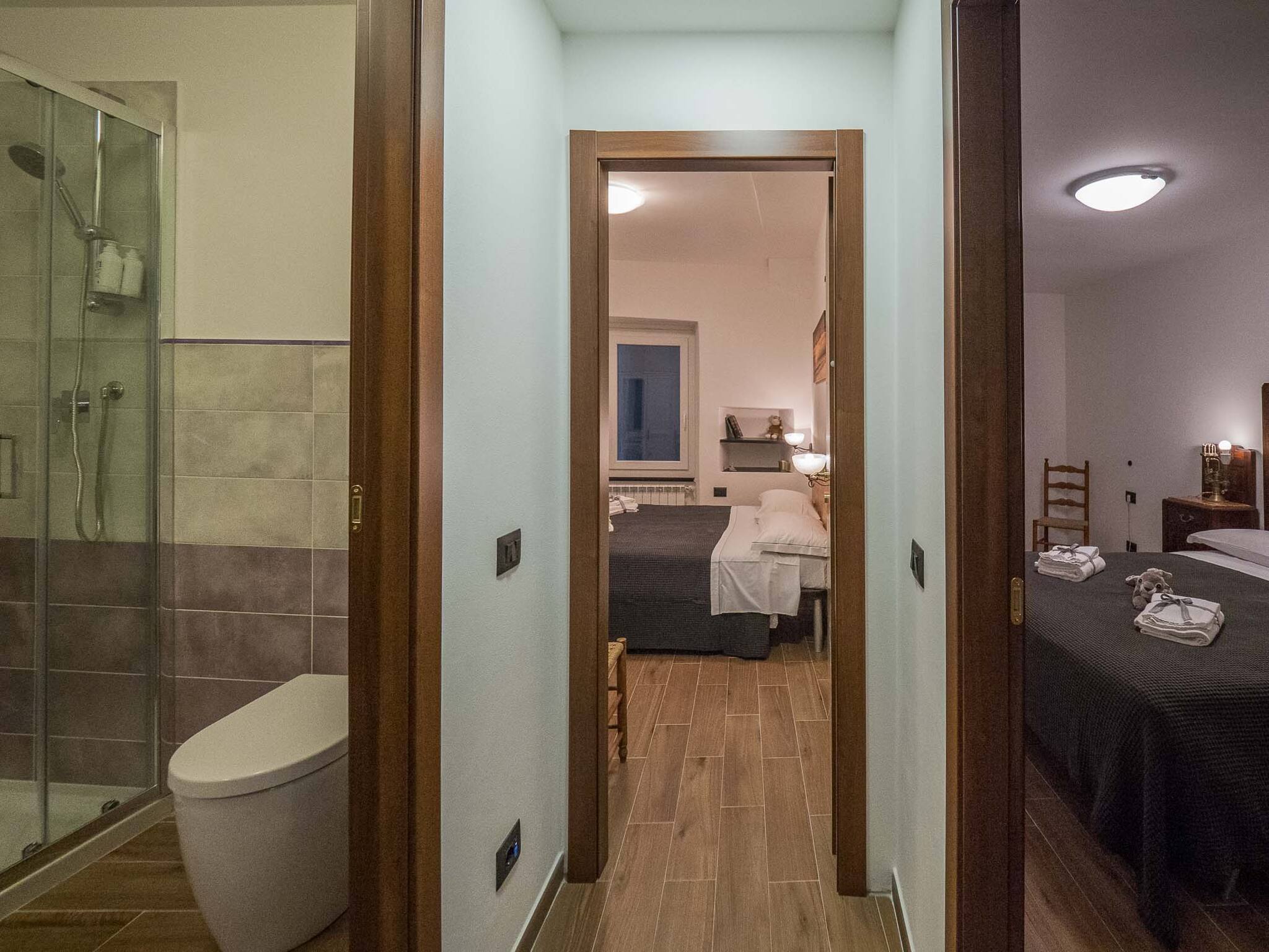 Um dos pontos altos do apartamento é a sua grande casa de banho azul com um chuveiro espaçoso—um luxo incomum nas pequenas aldeias das Cinque Terre. Esta característica adiciona um toque de elegância e praticidade, tornando a sua estadia ainda mais agradável.