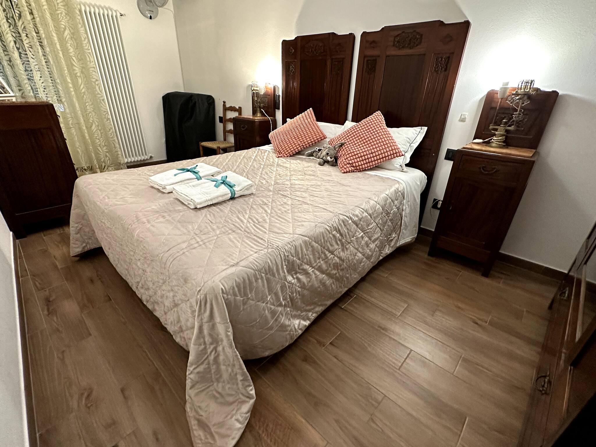 Quarto duplo espaçoso na parte de trás do apartamento, equipado com ventoinha.