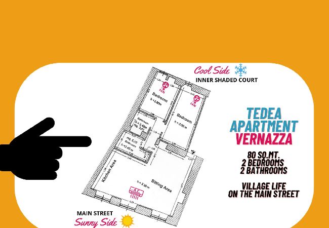 O apartamento em Vernazza tem 2 quarto(s) e capacidade para 5 pessoa(s). Alojamento de 80 m². Dispõe de máquina de lavar roupa, ferro de engomar, acesso internet (wifi), secador de cabelo, aquecimento central, ar-condicionado, 2 ventiladores, 1 Televisão.A kitchenette, de gás, está equipada com frigorífico, microondas, forno, máquina de lavar louça, louça/talheres, utensílios/cozinha, máquina de café, torradeira, jarro eléctrico e fogão.