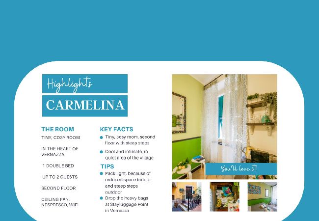 O quarto em Vernazza tem 1 quarto(s) e capacidade para 2 pessoa(s). Alojamento de 15 m². Dispõe de acesso internet (wifi), secador de cabelo, aquecimento com radiadores eléctricos, 1 ventilador.A cozinha, está equipada com frigorífico, máquina de café e jarro eléctrico.