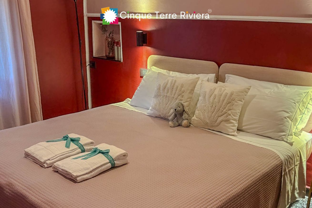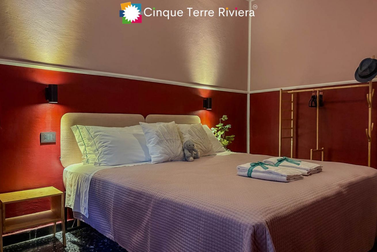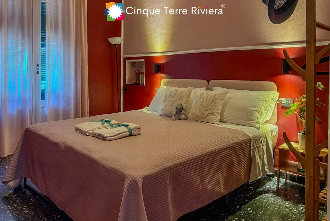 Ein zweites Doppelschlafzimmer (mit trennbaren Einzelbetten) öffnet sich auf einen kleinen Balkon mit Blick auf einen charmanten internen Caruggio — die engen Gassen, die für die Cinque Terre typisch sind.