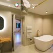 Upper floor: fully equipped kitchen opening onto a large private terrace, two comfortable double bedrooms and a spacious bathroom. Intermediate floor: elegant living room with double sofa bed and a large bathroom with wellness area.